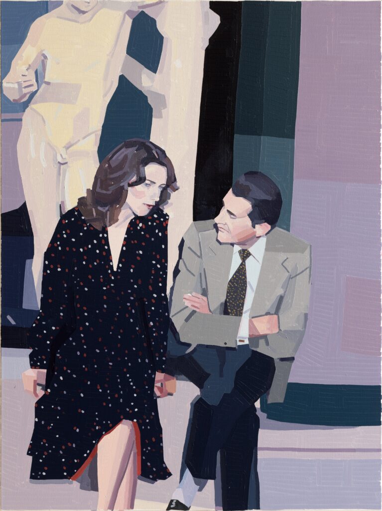 This work was made specifically for this Gala Auction. It is based off of a still from behind the scenes of the filming of The Night Porter (1974, directed by Liliana Cavani). The film is about a woman who bumps into her former concentration camp guard that works as a night porter in the hotel that she is staying in with her husband. It is set around 12 years after WWII. The woman and the guard begin a very disturbing relationship.