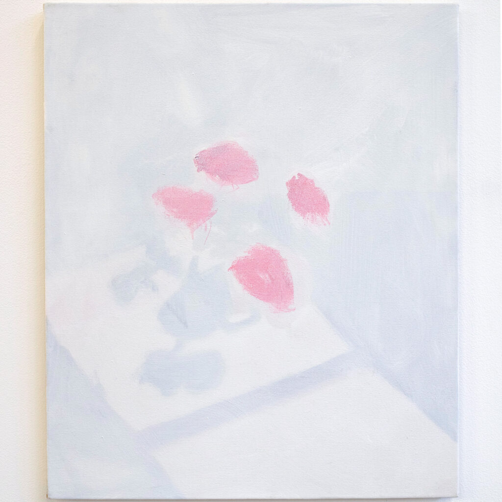 This painting began as a blank canvas, a moment of frustration, a desire to start over. Yet in the white void, I found a quiet peace – a space for reflection. The vast expanse of white evokes stillness and simplicity, while the subtle hint of red roses slowly reveals itself, creating a delicate contrast between presence and absence. Covering the oil with gesso reminded me of the fragility of the moment, how it might crack, much like life itself. The brief moment when sunlight hits a flower and casts its shadow on the ground inspired this piece. The interplay of white and red becomes a meditation on impermanence and fleeting beauty, inviting the viewer to reflect on the tension between what is visible and what is lost in time.
